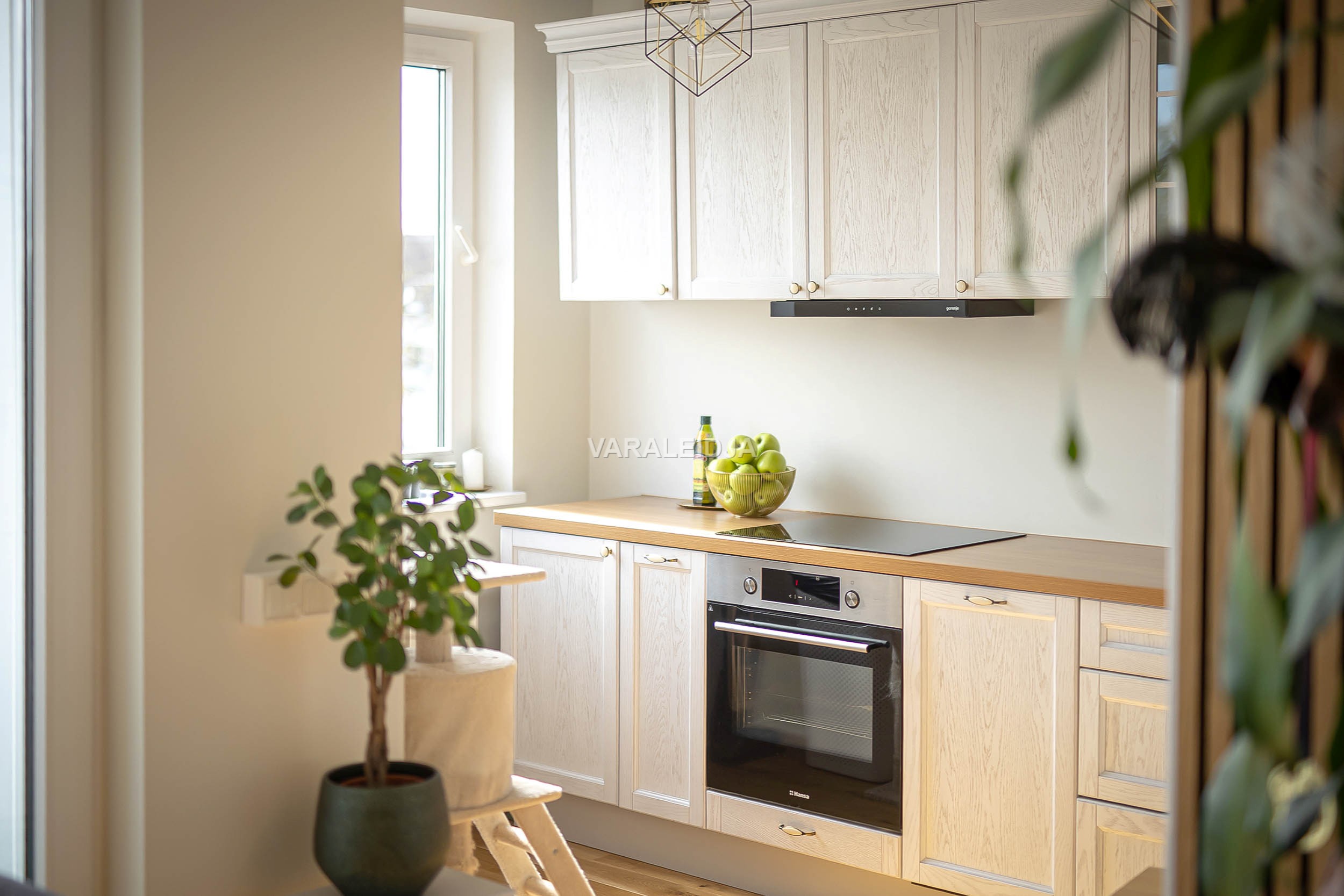 Köögimööbli uksed on täispuidust ning tööpinna kohal loob meeleolu trimmeriga LED-valgustus. Köök koos kogu tehnikaga (külmkapp, nõudepesumasin, joogiveepuhasti, küpsetusahi, õhupuhasti ja induktsioonpliit) kuulub müügihinna sisse.