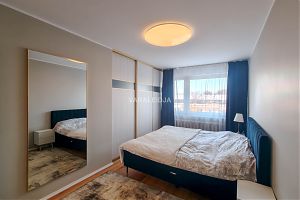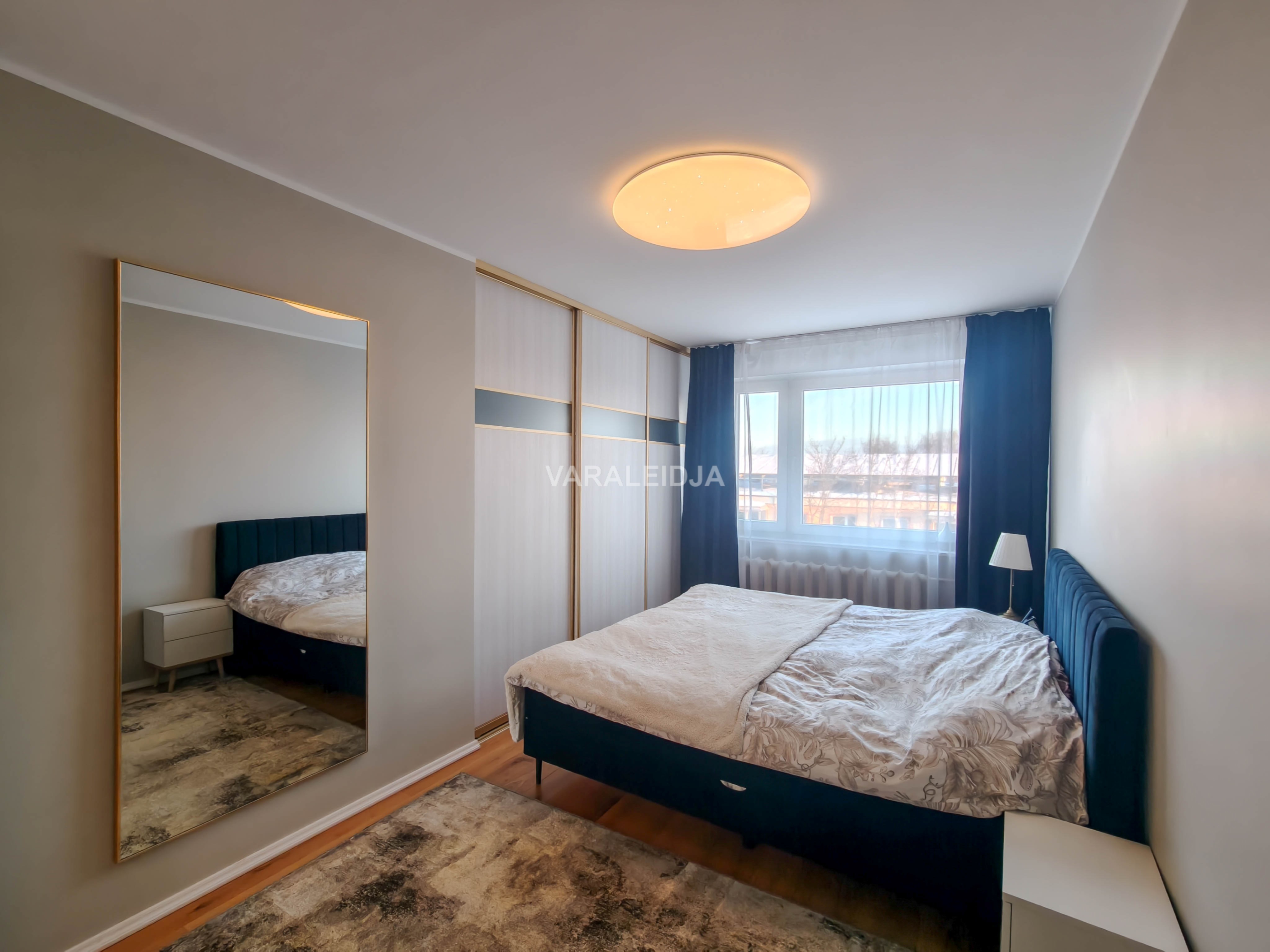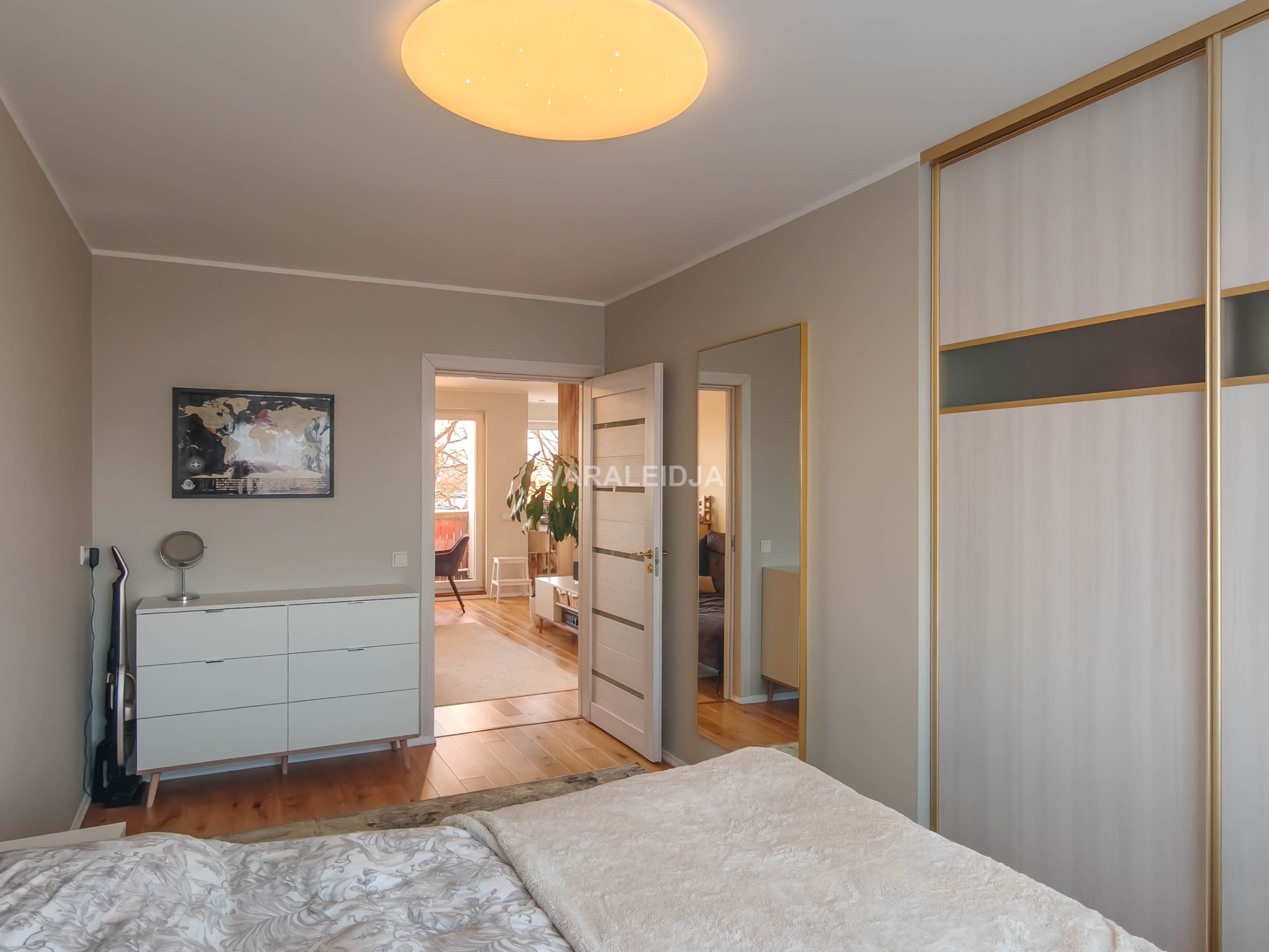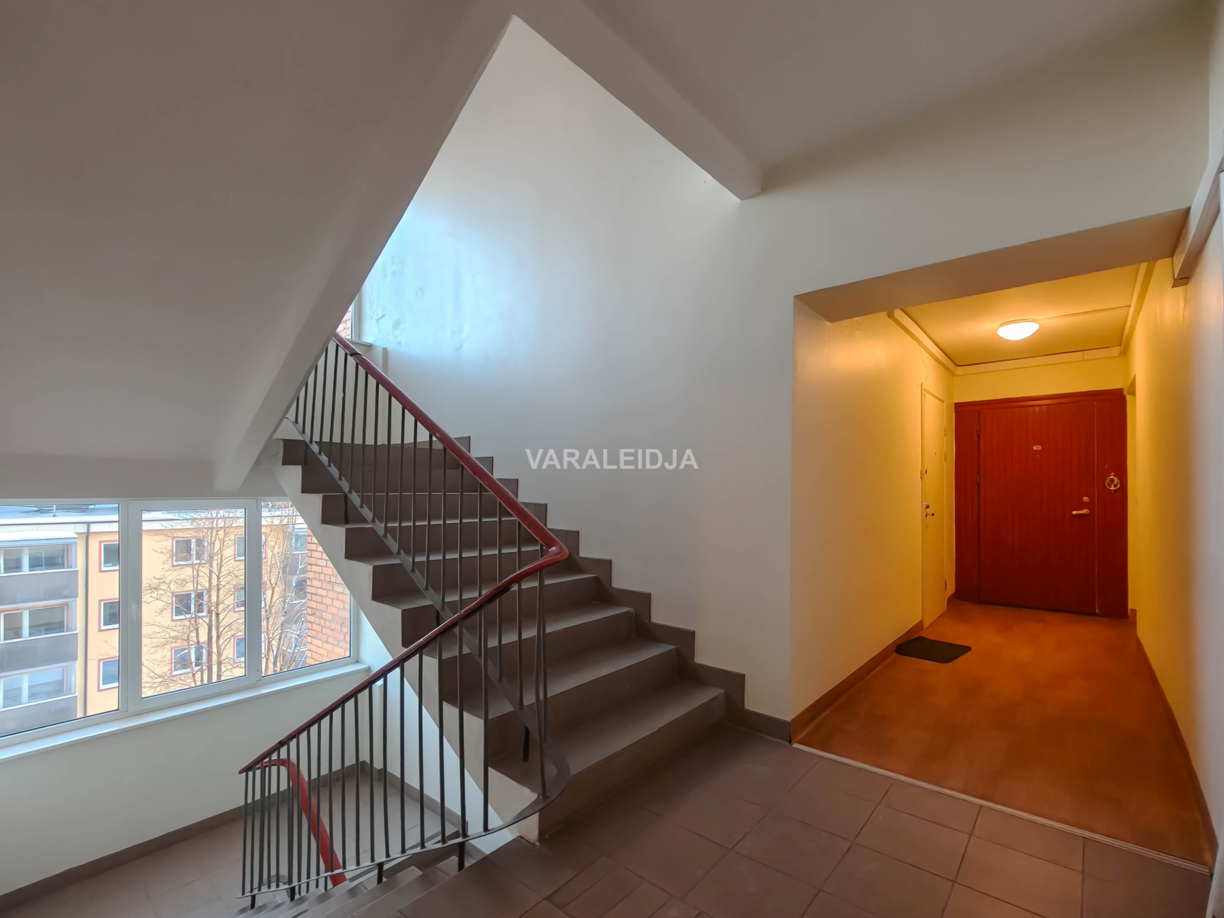 Korter jääb maja viimasele, ehk viiendale korrusele. Igapäevane trenn garanteeritud! Korterisse sisenedes jäävad esikust vasakule magamistuba või soovi korral kontoriruum ning vannituba koos tualetiga, paremale poole aga panipaik, kus asub pesumasin ja kuivati. Otse ees asub valgusküllane elutuba, millelt pääseb (6 m2) suurusele rõdule. Elutoa vasakul küljel paikneb teine magamistuba, kus asub suur peegelustega garderoobikapp.