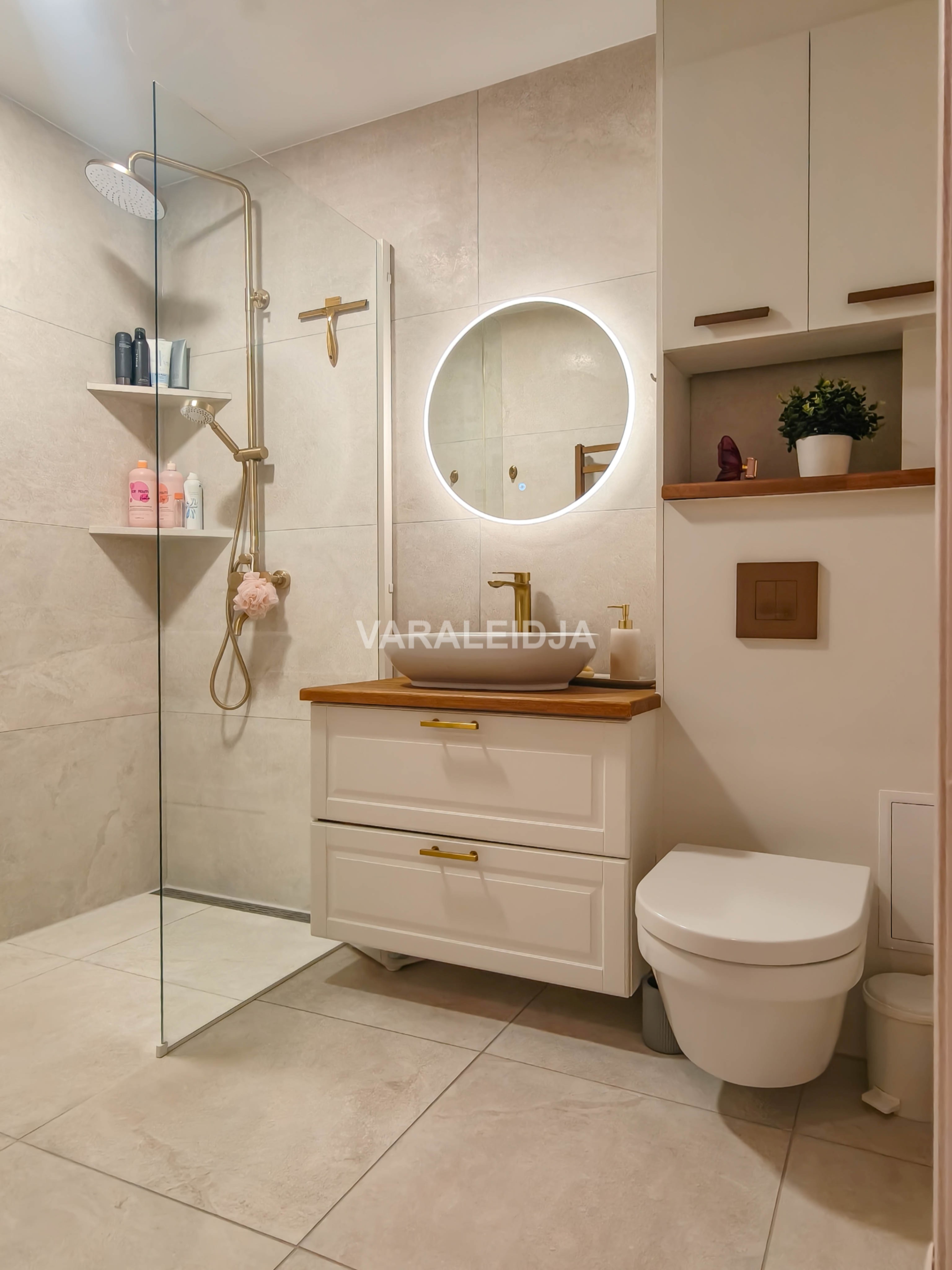 Vannitoas on valgustusega peegel, elektriline põrandaküte ning maitsekalt valitud Noto plaadid nii seintel kui põrandal.