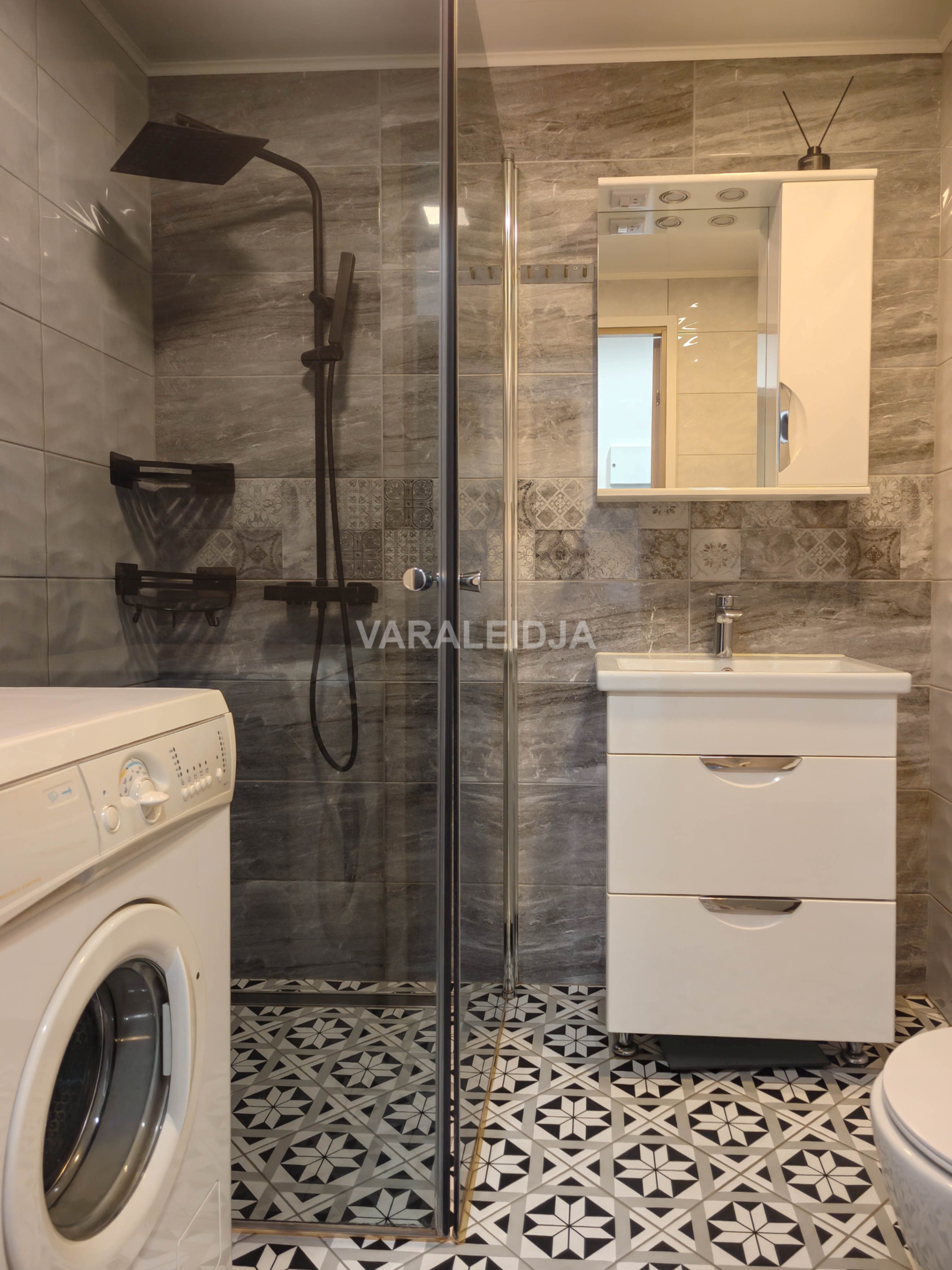Duširuumi ja tualetti on paigaldatud vastav mööbel ja pesumasin.