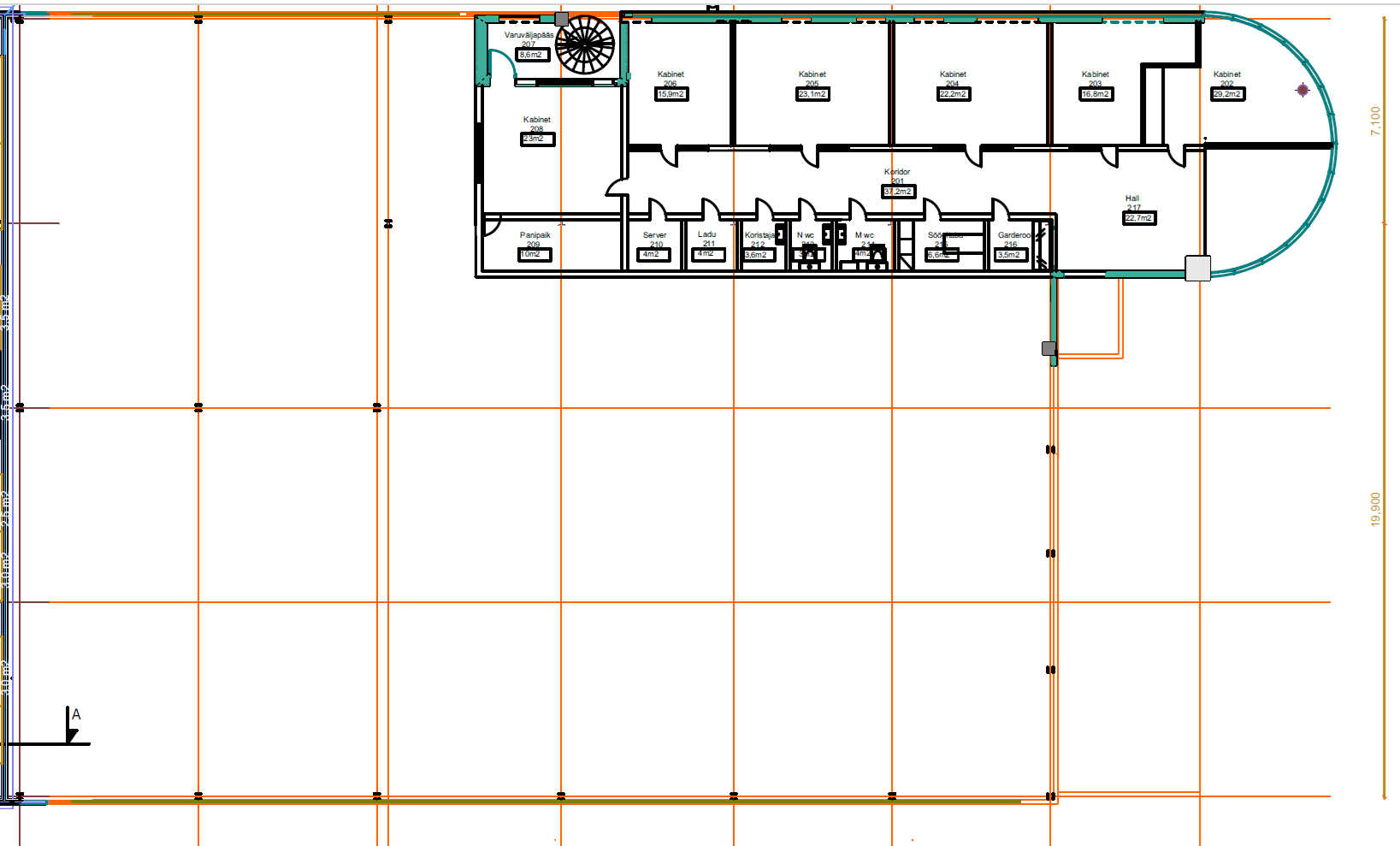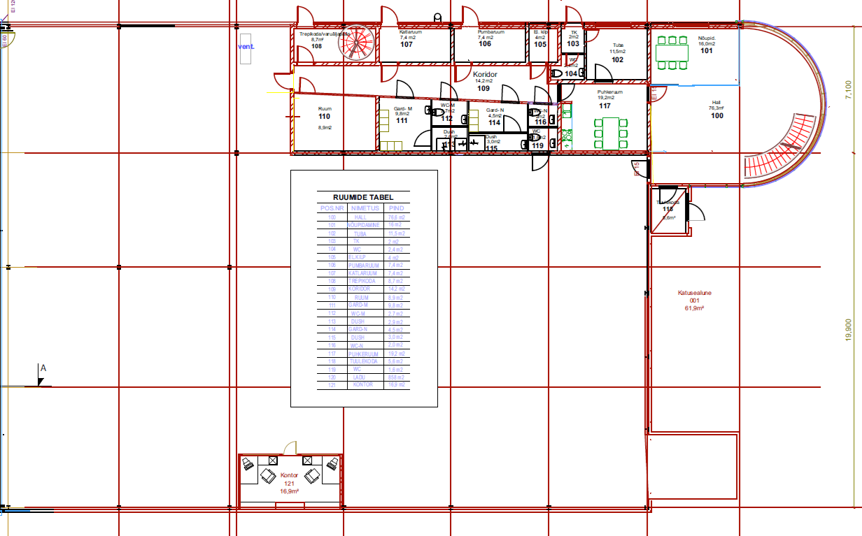 6 kabinetti, köök, 2 tualetti, panipaik, serveri ruum, garderoob, koristaja tuba.